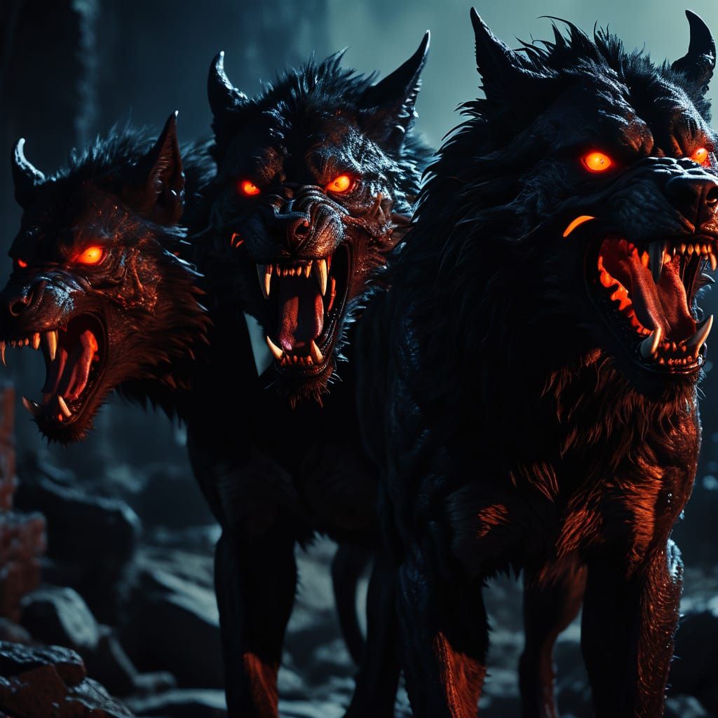 A dramatic image of a three-headed hellhound with glowing red eyes and bared teeth against a fiery underworld backdrop. The scene is rendered with cinematic lighting and intense detail.