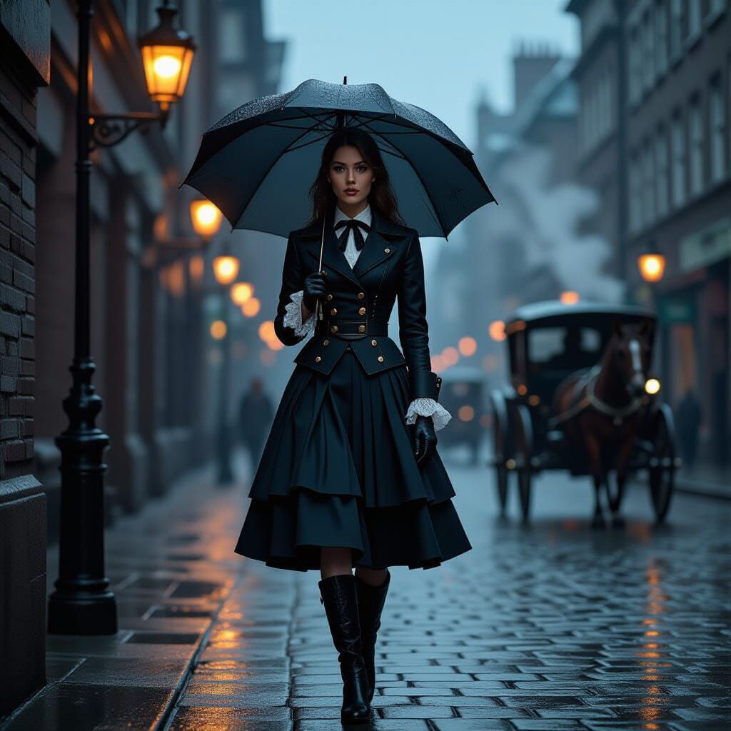 This image shows a young woman in Victorian attire standing on a wet, gaslit street at night. The scene features a horse-drawn carriage and rising smoke, rendered with cinematic lighting and intricate detail.