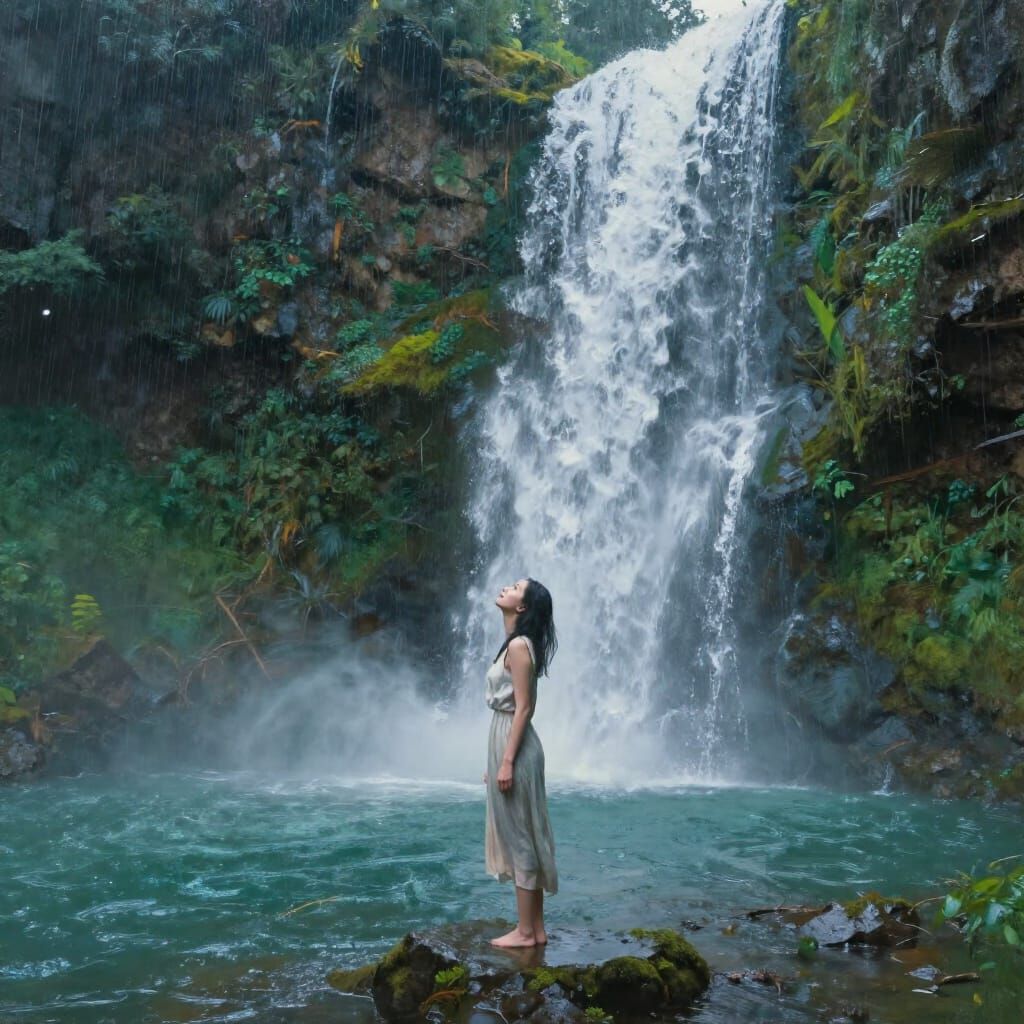 This image shows a woman beneath a cascading waterfall, looking up in awe during a gentle rain. Rendered in a realistic oil painting style, it evokes serene contemplation and natural beauty.