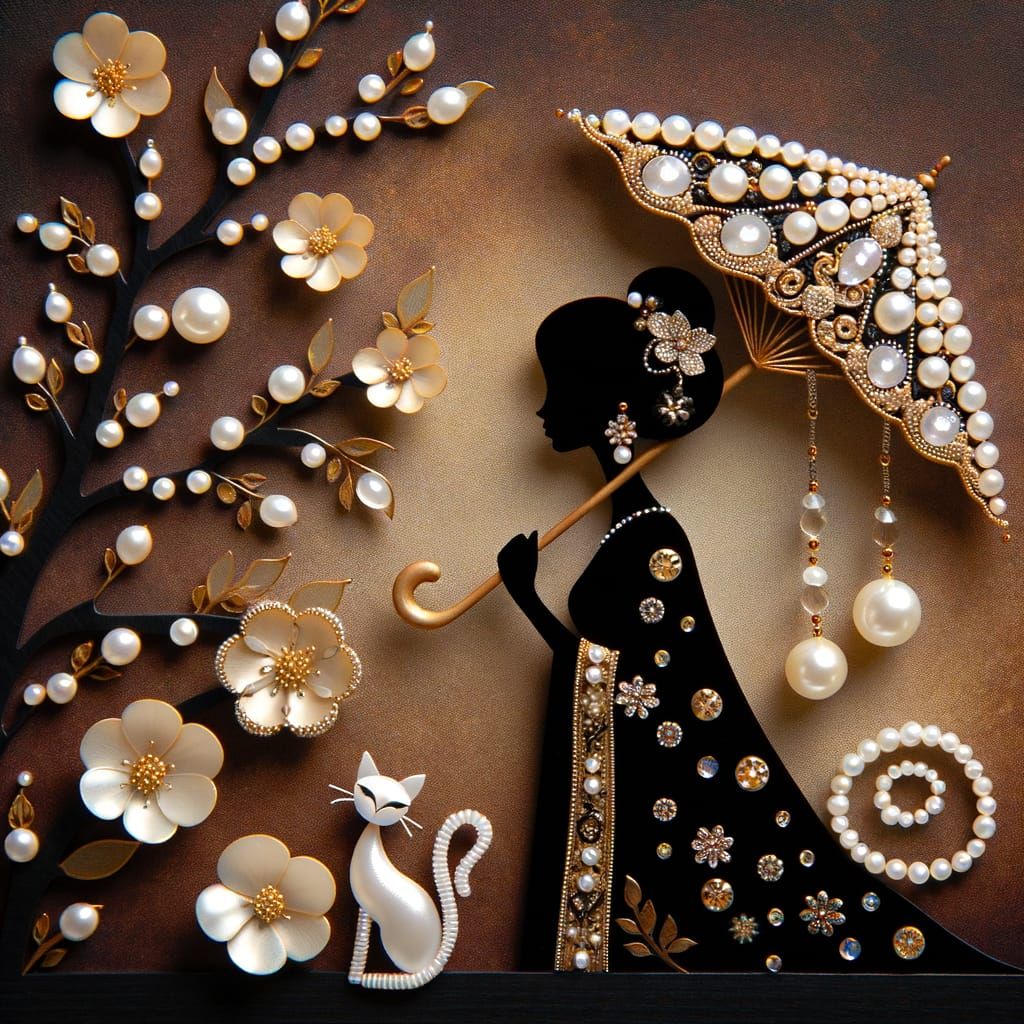 This image shows a silhouetted woman with a pearl umbrella, surrounded by golden blossoms. A beaded cat sits on a floral branch in this enchanted forest scene. The artwork has a whimsical aesthetic.
