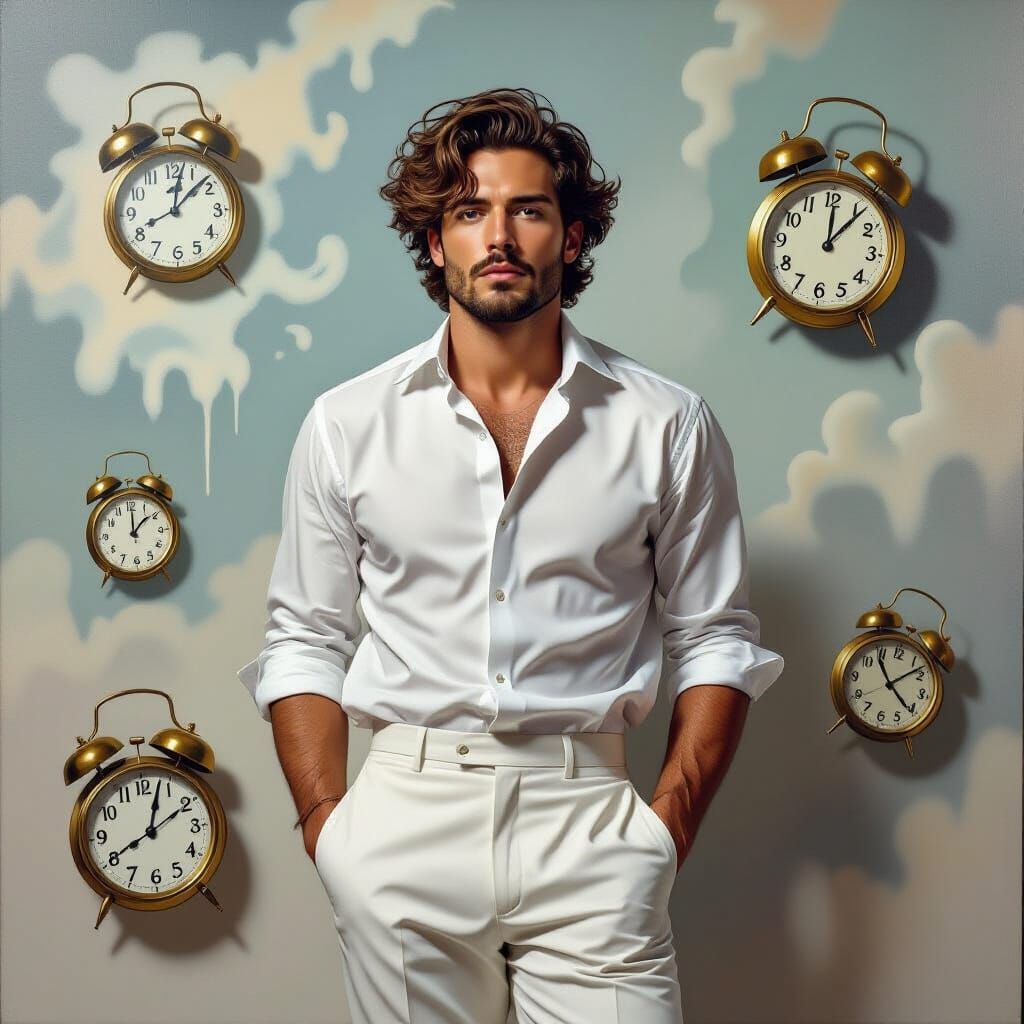 This image shows a figure in a white shirt and trousers in a surreal dreamscape. The artwork features melting clocks and distorted objects in a monochromatic style, reminiscent of oil on canvas.