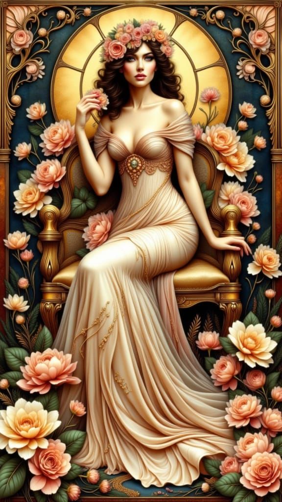 A full body, top down view of an elegant figure with art nouveau style, seated on a throne with floral halo. Bathed in warm evening light.