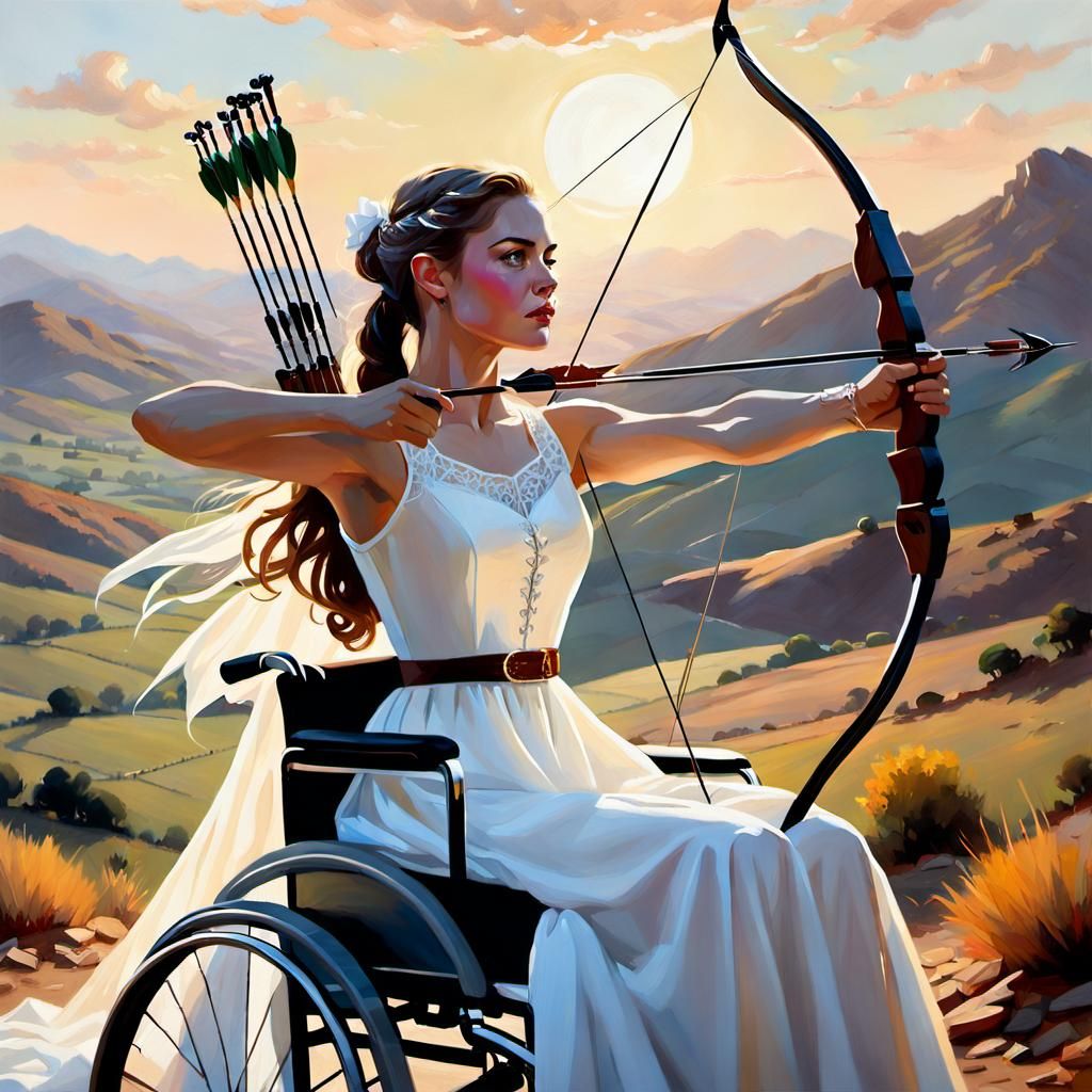 A serene oil painting of Artemis in a wheelchair practicing archery at sunrise. The artwork features a soft color palette and classical elements, reminiscent of impressionist paintings.
