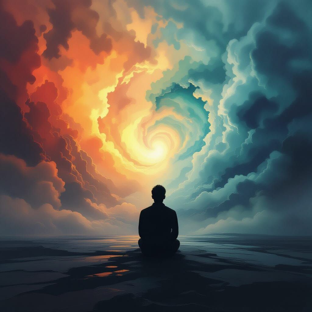 This image visually represents psychiatric projection and the emotional turmoil of grief through a solitary figure against a turbulent, abstract landscape. Captured with dramatic lighting and a shallow depth of field.