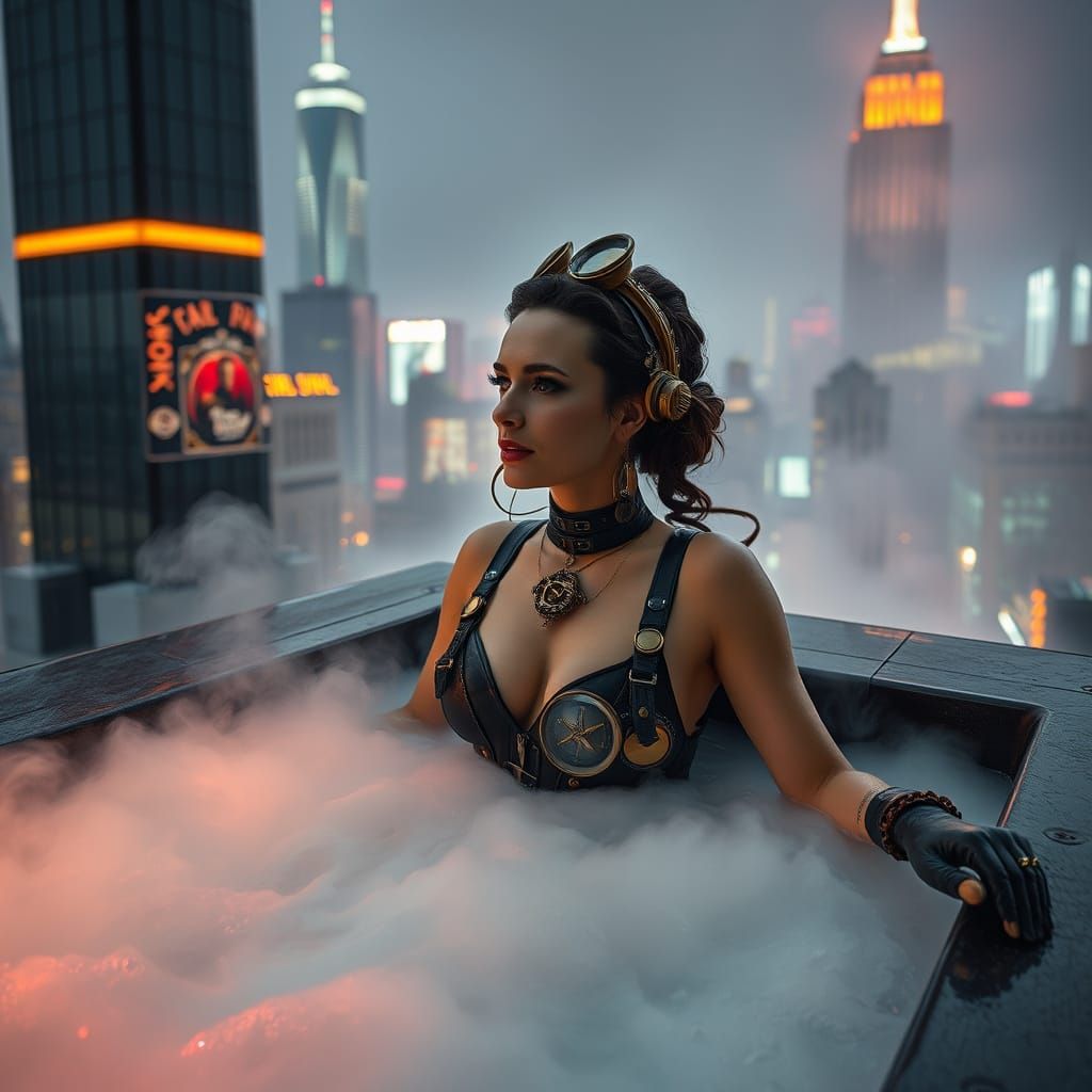 A photorealistic portrait of a steampunk woman relaxing in a rooftop hot tub. Rising steam, intricate brass attire, neon lights and a futuristic city skyline complete this cinematic scene.