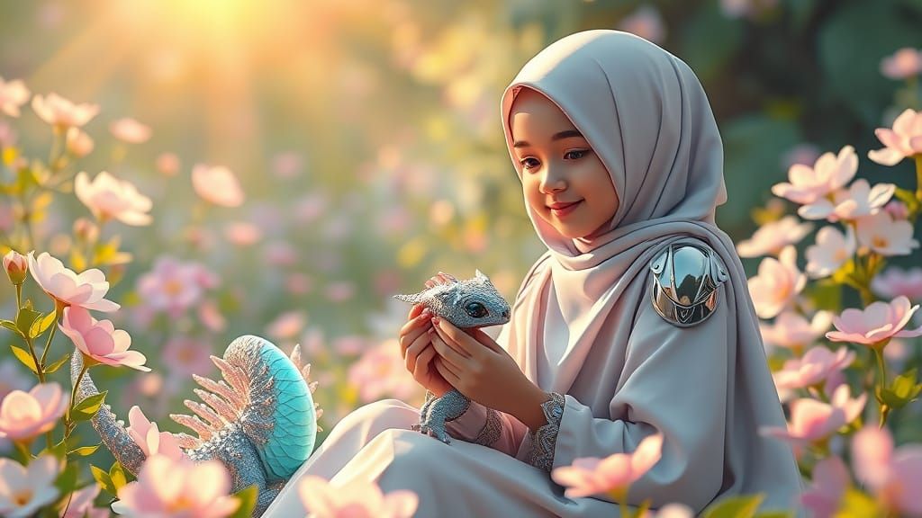 a 20-year-old Indonesian muslim girl wearing a soft-flowing hijab, sitting peacefully in a blooming fantasy garden, smiling as she plays with a cute, small dragon with shimmering pastel scales, beside her is EVA, a futuristic hijabi android with glowing cyan eyes and a modest metallic robe, both enjoying the moment, vibrant flowers, bioluminescent petals, soft sun rays, ethereal atmosphere, gentle wind, anime-inspired style, ultra-detailed, cinematic lighting, whimsical mood, magical realism, full body, dynamic composition, --v 6 --style raw --ar 16:9