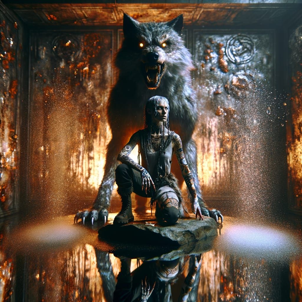 This image shows a woman with grey eyes and fur-like skin, intertwined with a werewolf's head. She poses atop a stone in an amber-lit room with metallic walls, enhanced by water splashes creating a double exposure effect. The scene has a gritty, gloomy horror aesthetic.
