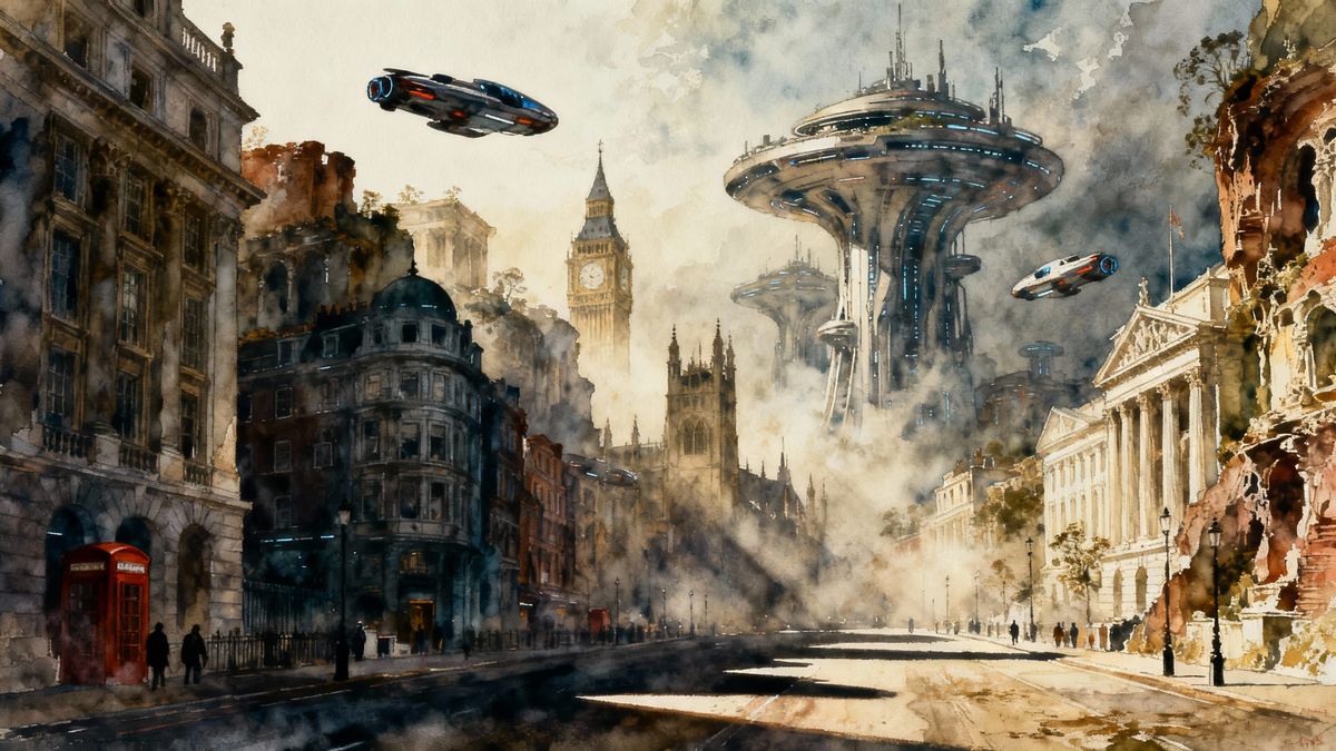 A watercolor illustration of futuristic London in 2100, featuring flying vehicles and intricate architecture. The soft, blended textures and muted colors create a hazy, atmospheric mood with dramatic lighting.