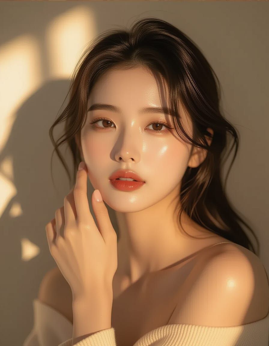 This image shows a Korean woman in an elegant pose, illuminated by soft, warm light. The portrait captures a mysterious glow with cinematic color grading and intimate lighting, highlighting natural beauty.