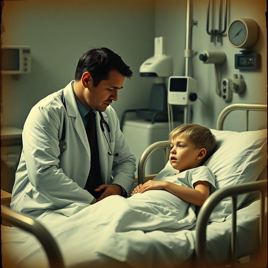 A vintage image of a doctor sitting with a sick child in a hospital. The scene evokes nostalgia through its sepia tones and film grain, capturing a moment of concern in a classic photographic style.