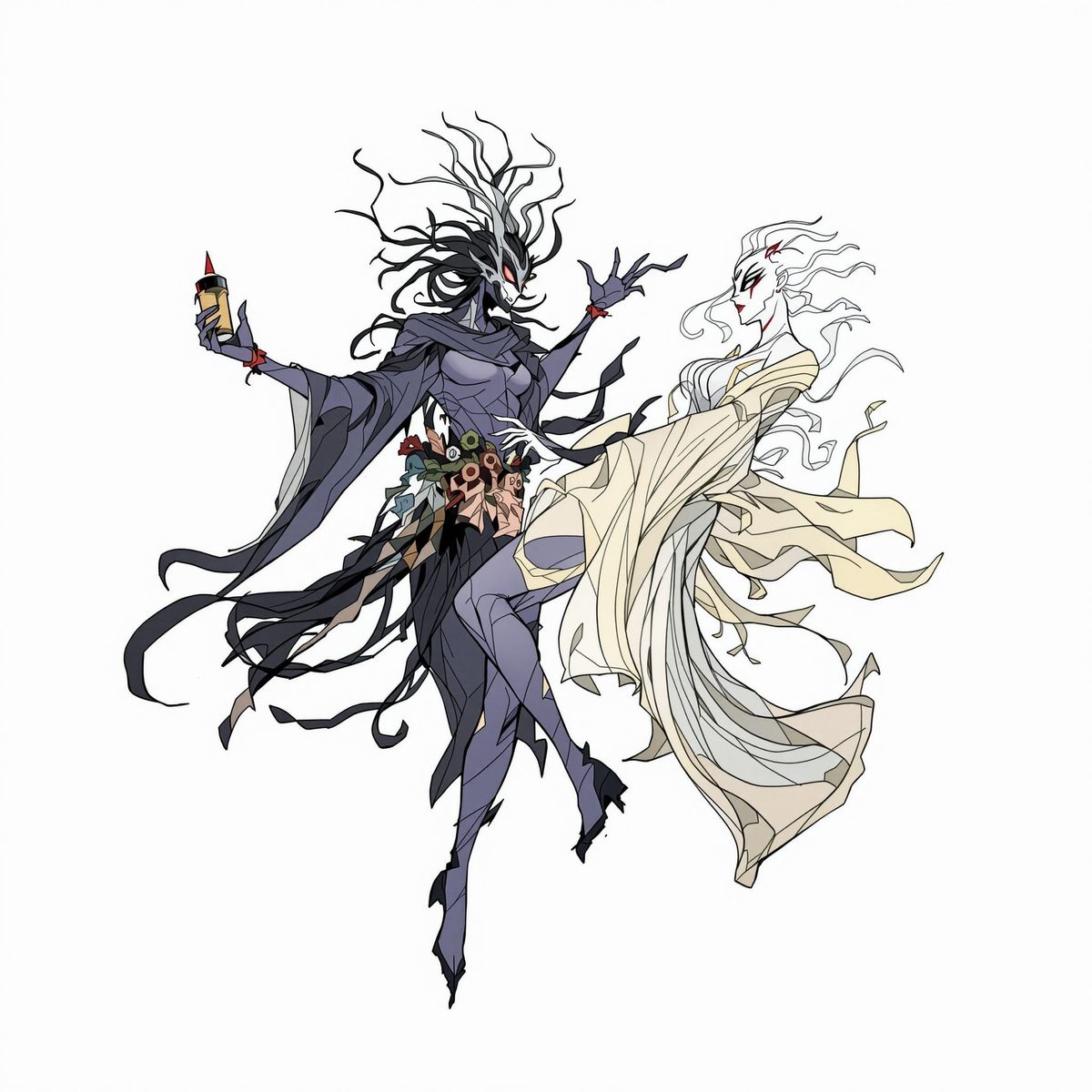 This image shows a fusion of Benzaiten and Hannya spirits, portrayed as powerful and beautiful figures. They are depicted in flowing robes, with a hint of ethereal floating, as digital art.