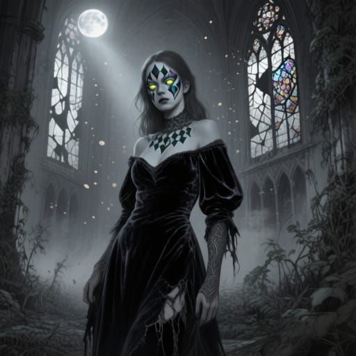 A striking picture of a woman with glowing eyes and harlequin makeup in a ruined cathedral. Overgrown plants and moonlight filtering through shattered glass create a dark fantasy atmosphere in charcoal drawing style.