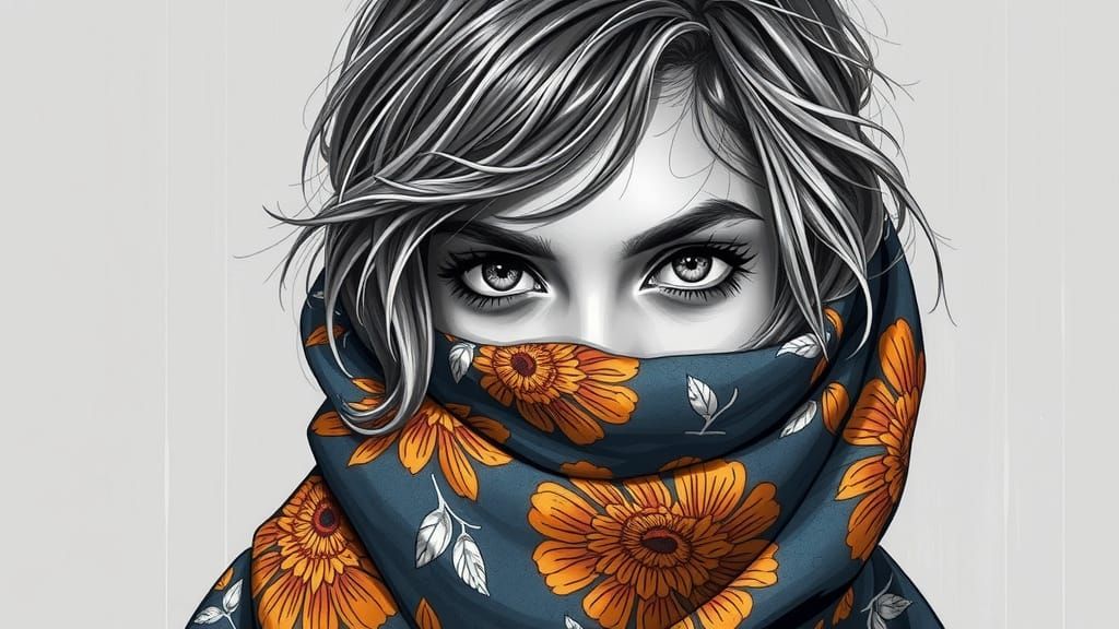 A striking grayscale portrait of a young woman with piercing eyes, partially shrouded by a colorful scarf with intricate floral patterns, set against a textured gray background.
