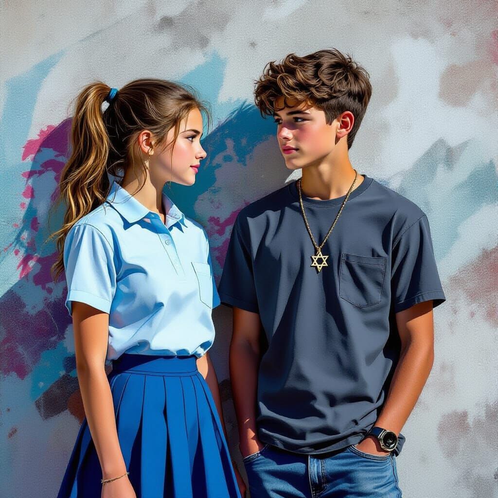 A digital artwork featuring a teenage girl and boy standing in front of colorful graffiti. The image uses vibrant colors, layered textures and high contrast in a splash art style.