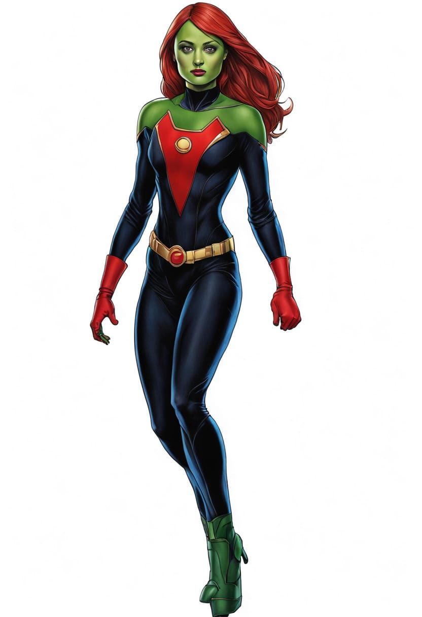 This image shows a hyperrealistic portrait of Ella Purnell as Miss Martian. She has green skin, red hair, and is wearing a black and dark green Martian Manhunter outfit with a blue cape, in the Justice League Watchtower.