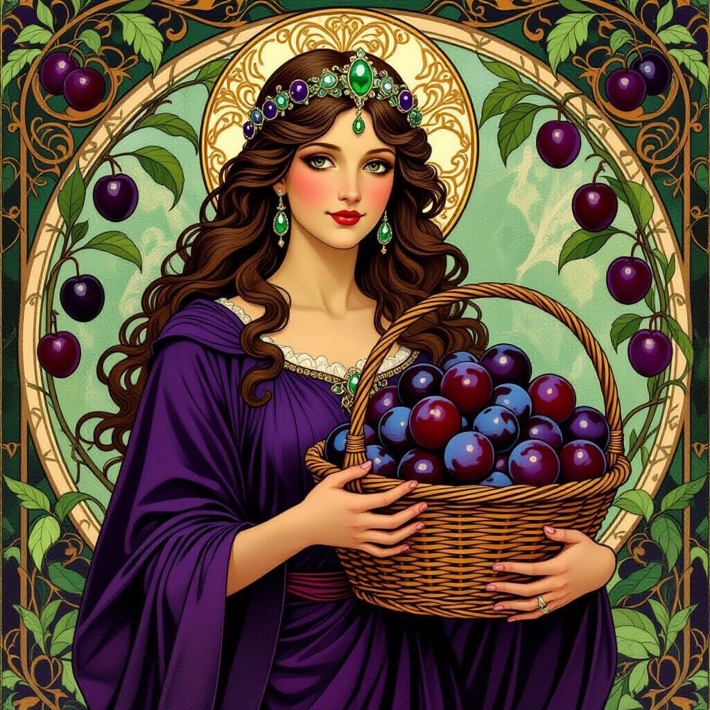A portrait of a goddess adorned with plums and prunes, in flowing purple robes. The image is rendered in an art nouveau style, with lush colors and intricate details.
