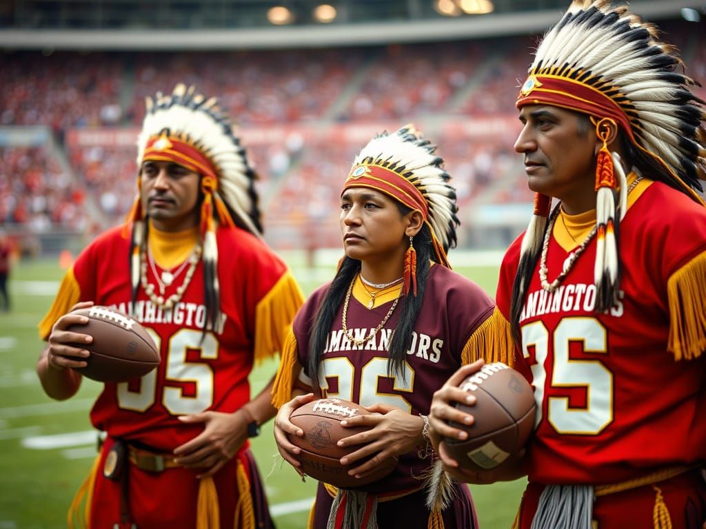A 35mm photorealistic image of Native Americans in Washington Commanders jerseys holding footballs. Features a shallow depth of field, sharp textures, and vibrant colors.