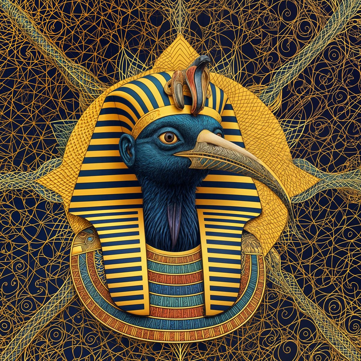 A striking picture of a man with the head of an ibis, adorned with a pharaoh's headpiece. The artwork features abstract vector fractal elements and 3D shading.