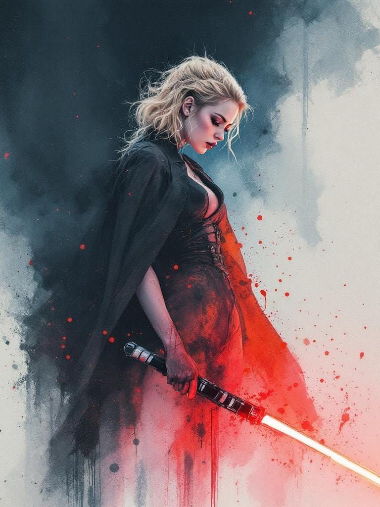This image depicts a full-body view of a 1950s pin-up woman with bold eye contact, holding a lightsaber in a Star Wars setting. The artwork features a unique blend of watercolor, ink splatters, and atmospheric effects.