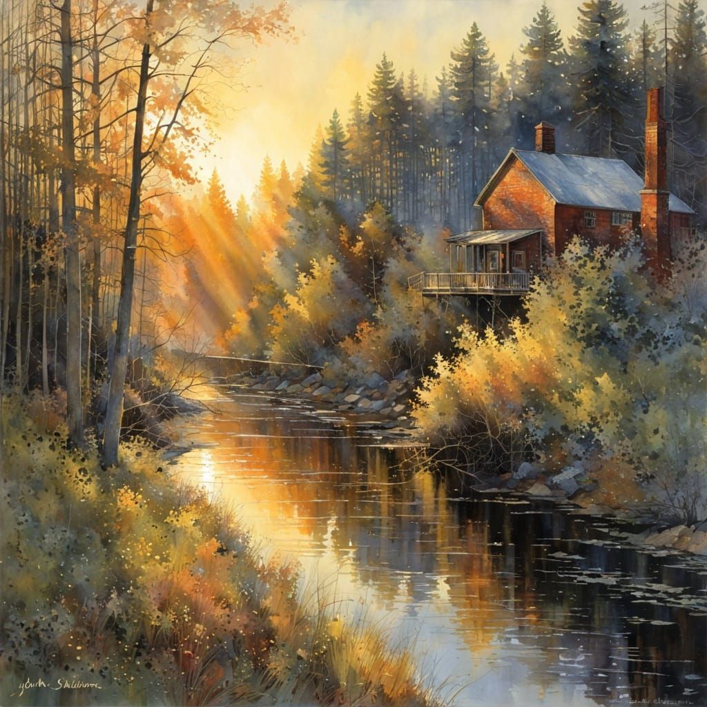 A vibrant watercolor painting featuring crepuscular rays filtering through the clouds. The artwork captures the ethereal beauty of light and atmosphere, rendered with fluid brushstrokes.