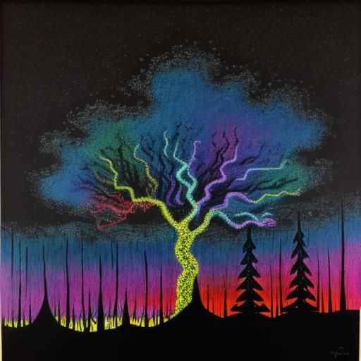 This image depicts a dynamic and colorful forest scene, characterized by strong contrasts and a sense of movement, in the style of Dadaist art and reminiscent of the works of Piet Mondrian and Keith Haring