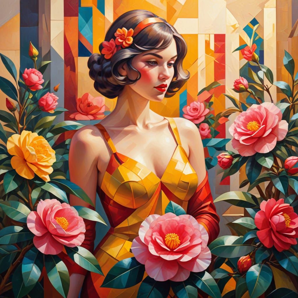 This image shows a cubist painting of camellias, women, and vases in a garden. The artwork employs geometric shapes, fragmented forms, and vibrant, colorful petals with soft focus. It is rendered in warm, golden lighting.