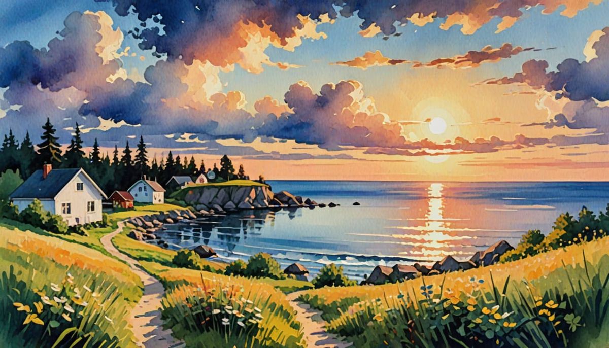 This image shows a summer cottage on the shore in Scandinavia, under the bright midnight sun of midsummer. The artwork is rendered as an impressionist gouache and watercolor painting.