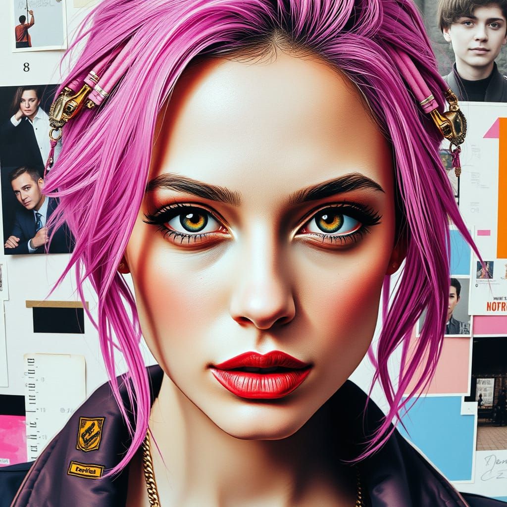 This image is a vibrant, multi-layered portrait of a woman with pink hair and brown eyes, created in a style that blends edgy street art with realistic hyper-detail and a mix of fragmented icons and textures.