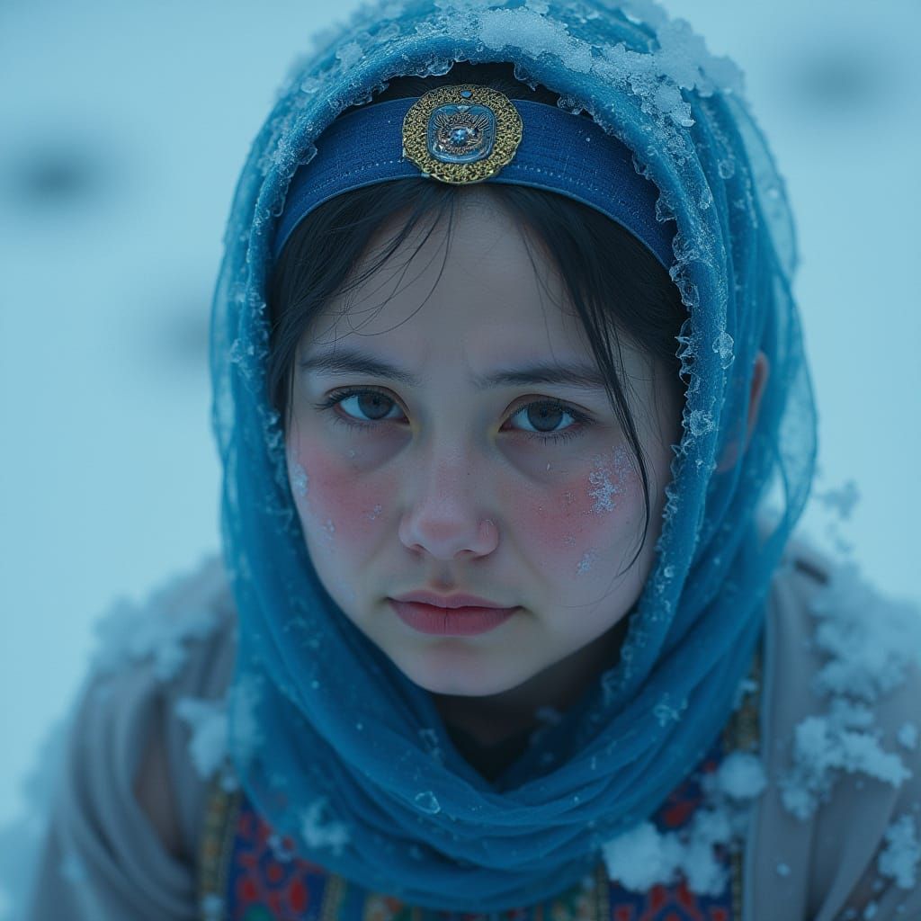 A poignant image of a woman in traditional clothing, trapped within a block of ice. Frozen tears mark her face, illuminated by cold, cinematic lighting, with a matte painting aesthetic.