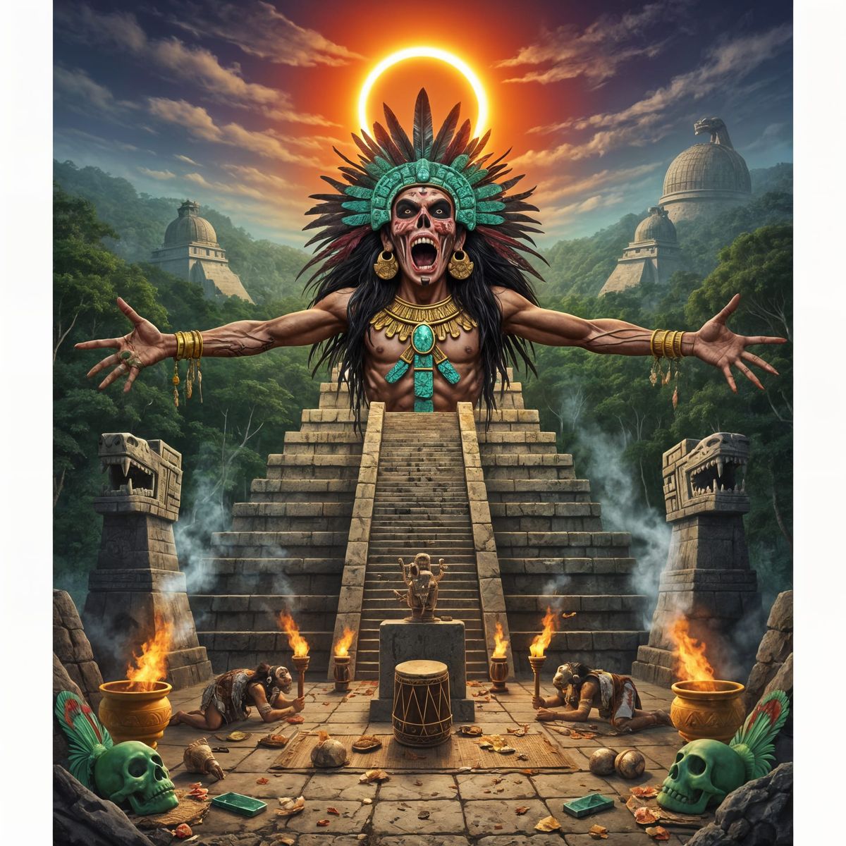 Hyperrealistic airbrushed illustration of Mictlantecuhtli on a blood-stepped pyramid during a solar eclipse. Dramatic lighting highlights jade inlays, obsidian teeth, and ceremonial details.
