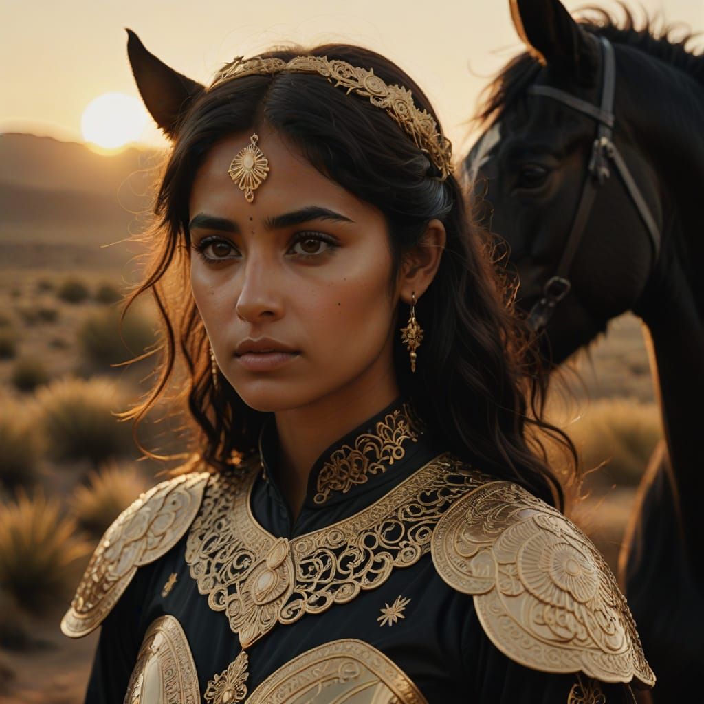 This image shows a stunning close-up of a Pakistani-Scottish woman in a kelpie-inspired costume. Her brown eyes are piercing, with golden hour lighting illuminating her features in a hyperrealistic style.
