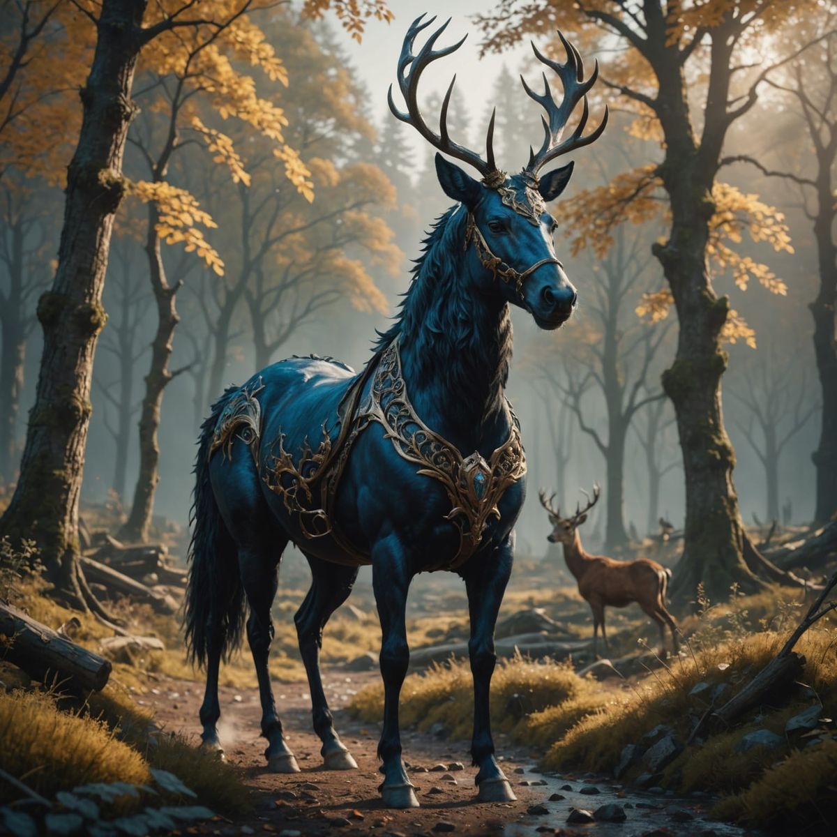 A detailed matte painting of a fantastical horse-deer hybrid with intricate details and complementary colors. This 8k resolution fantasy concept art is trending on Artstation.