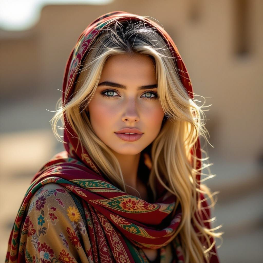 A photorealistic portrait of a blonde actress in traditional Afghan attire, echoing the iconic pose and vibrant colors of Steve McCurry's work, captured with dramatic golden hour lighting.