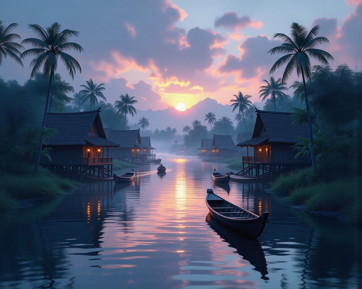 Imagine a breathtaking digital artwork of a traditional Surinamese village nestled along the banks of the Suriname River.
