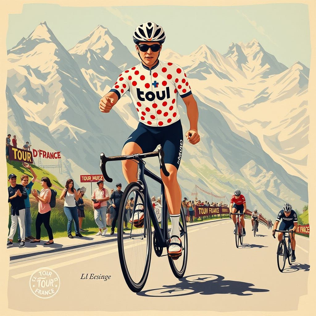 This image shows a vintage-style illustration of a cyclist in the Tour de France climbing Alpe d'Huez. Cheering spectators and retro bicycles add to the energy of this nostalgic scene in graffiti art style.