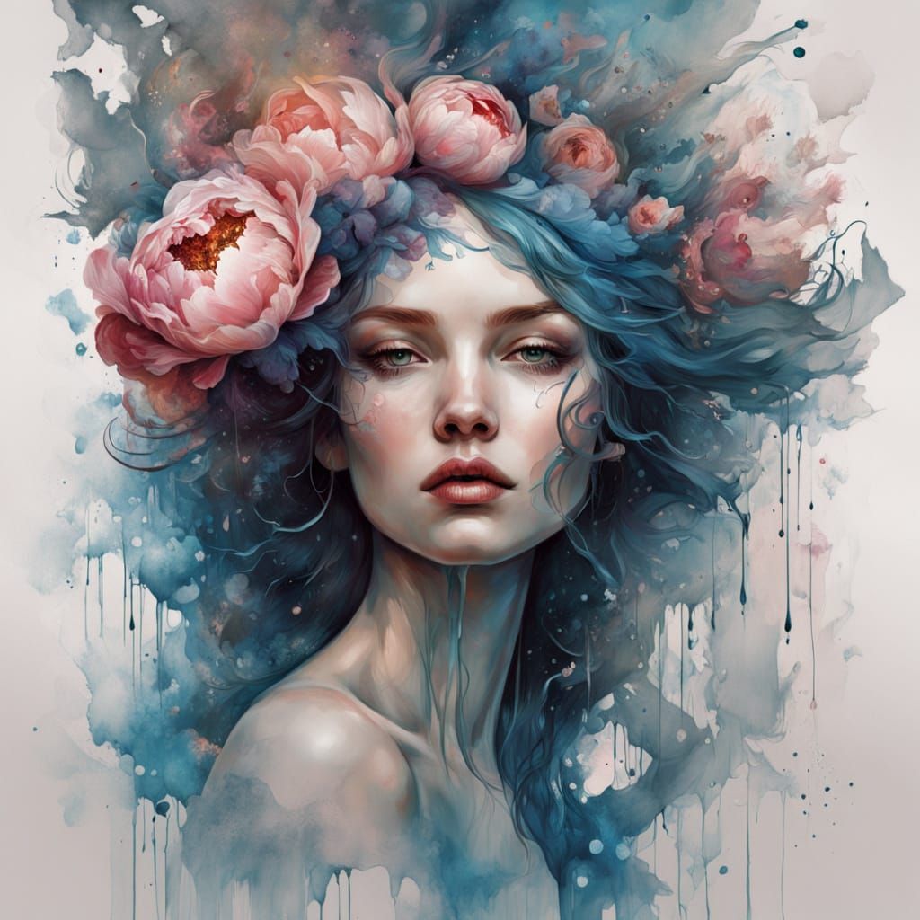 This image features a close-up of a woman surrounded by dripping paint and loose lines, with delicate brushstrokes blending with surreal elements in a dynamic composition with intricate patterns and textures, evoking a dreamy, ethereal quality