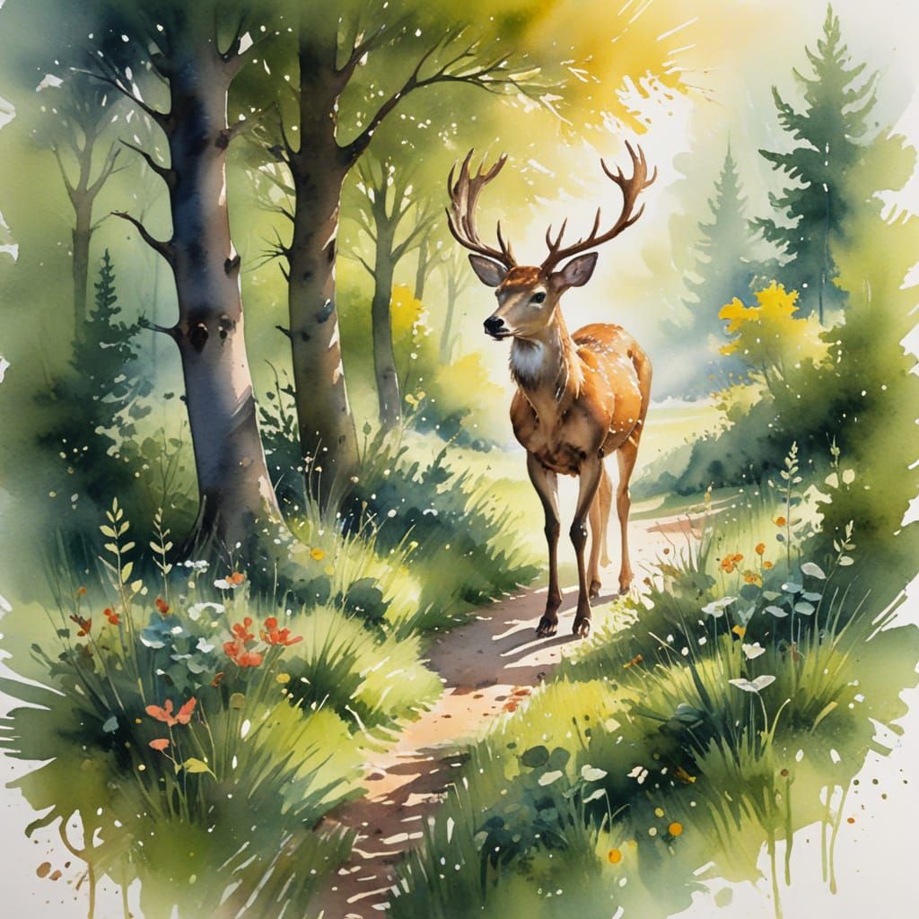 This image shows a radiant deer in a sunlit meadow. The artwork is rendered with expressive wet-on-wet watercolour techniques, featuring dynamic brush strokes and bleeding pigment edges.