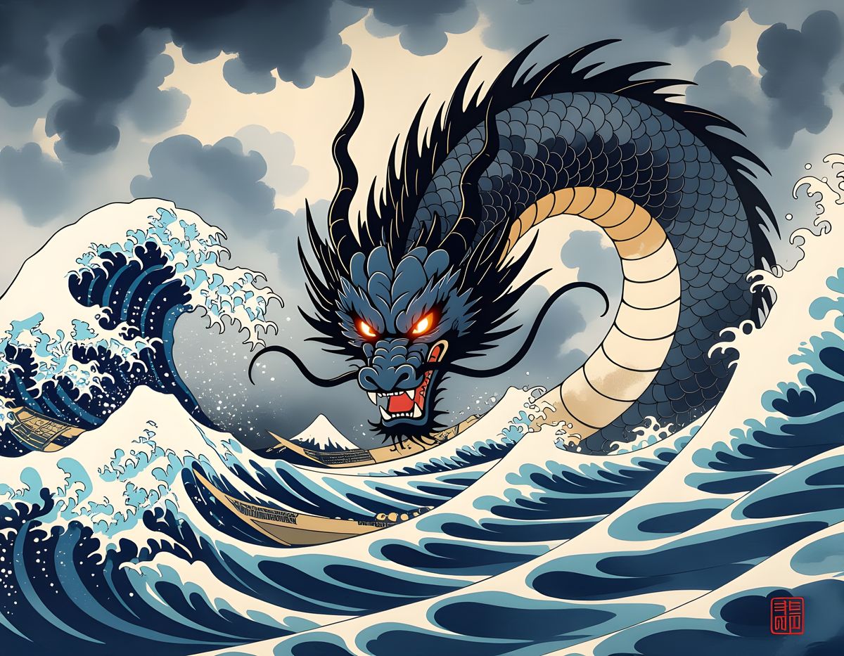 Ancient Japanese ink painting. Close-up shot. Jörmungandr rises from the ocean depths, encircling the world. Sumi-e style. His eyes burn with ancient knowledge. The ocean churns with his immense power. The sky is dark and stormy. Monochromatic ink wash. Dramatic lighting. Best quality, a masterpiece, incredibly detailed, dynamic composition, high contrast, evocative, atmospheric, trending on Artstation.