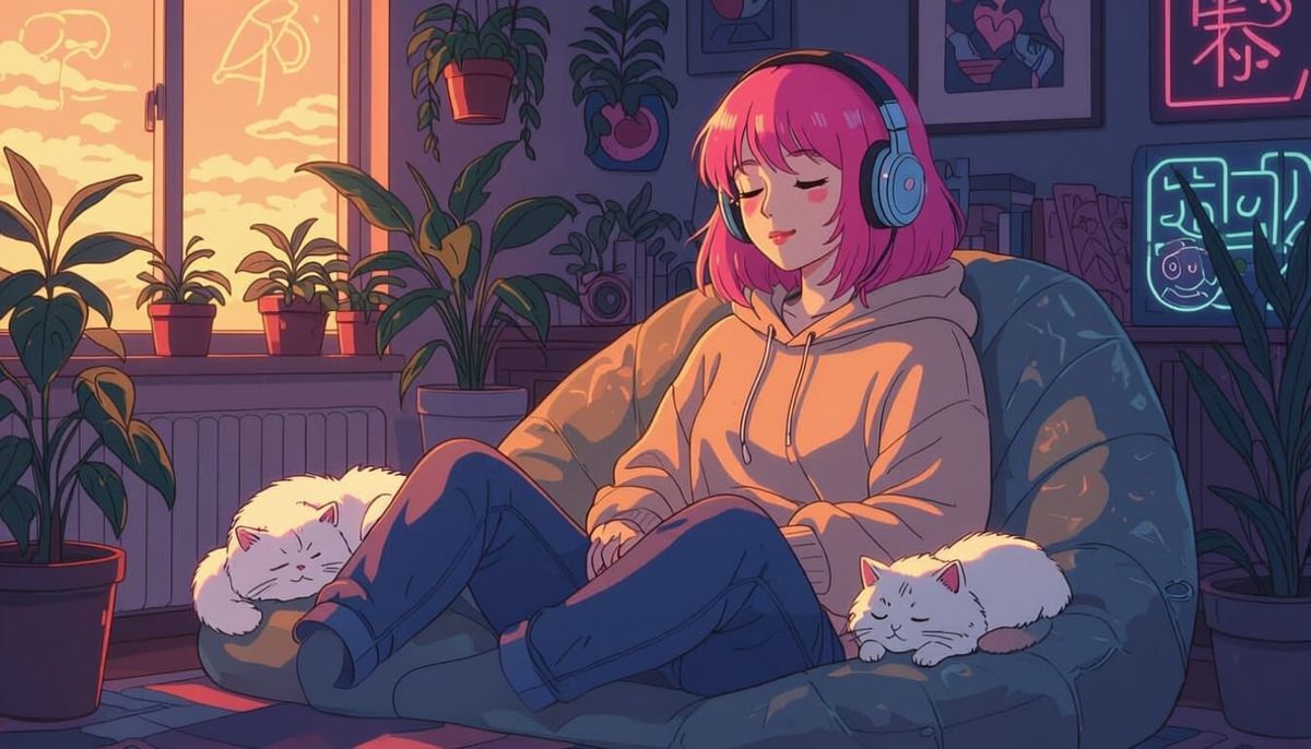 This image features a young woman with pink hair enjoying music with her cat, in a cozy, neon-lit room. Rendered in a distinct Japanese comic art style with bold lines and soft lighting.