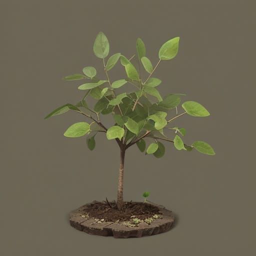 This image shows a sapling creature with a round trunk and leafy tuft. Faint features create a curious face, while small roots act as legs. Red buds hint at future apples, with a sweet fragrance attracting bugs.