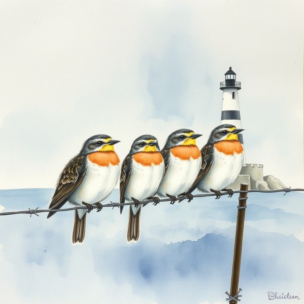 A watercolor painting of birds perched on a barbed wire fence, with a distant lighthouse. The artwork captures a blend of symbolic, wildlife, and landscape art styles.