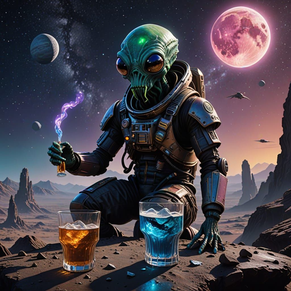 A captivating scene of two alien beings sharing whisky on the moon. One is an insectoid scholar, and the other is a bioluminescent, squid-like spacefarer in a cyberpunk aesthetic.