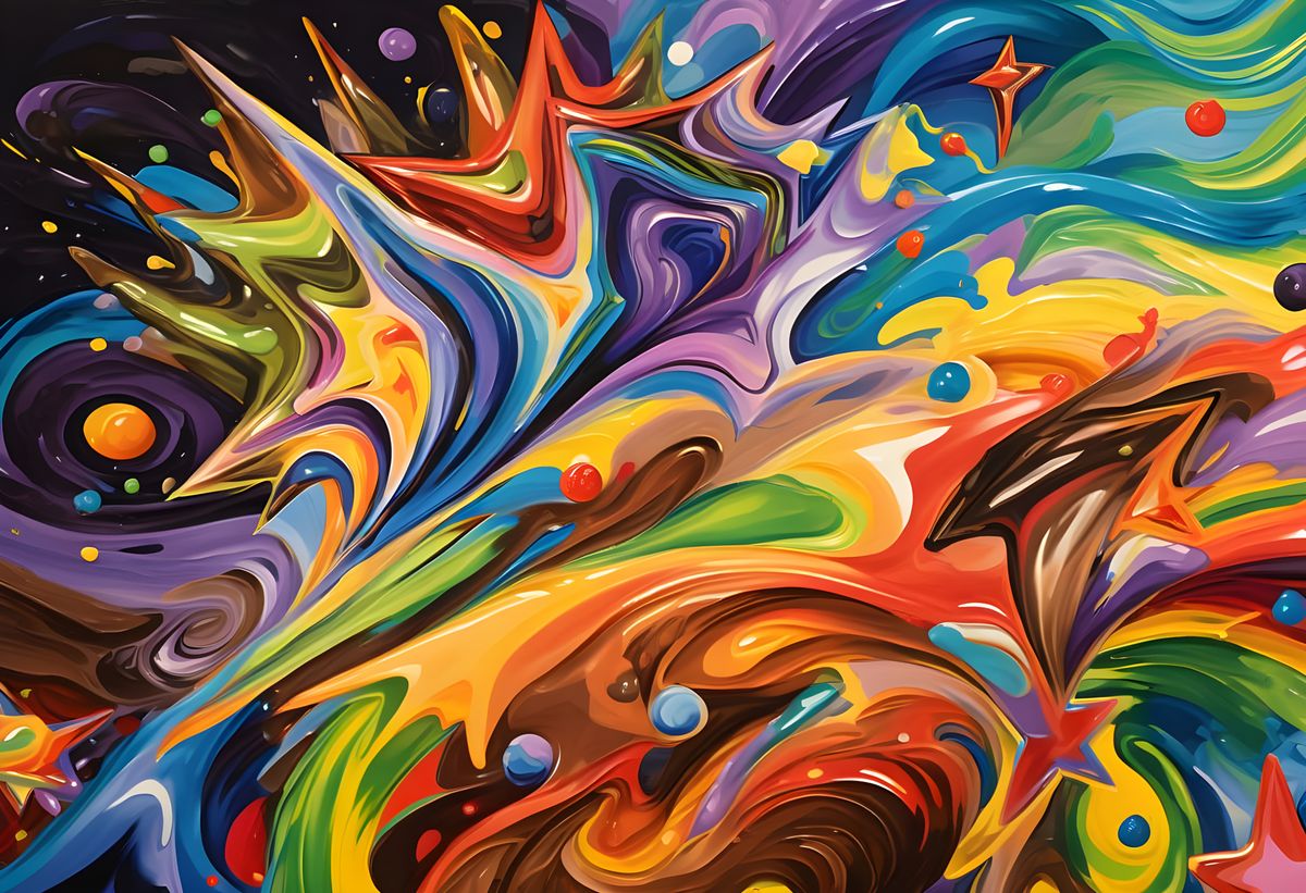 This image showcases overlapping 3D helical vortex maelstroms of paint and plasma, with vibrant, multi-colored pointy stars. It features expressive brushstrokes creating depth and motion in an otherworldly, tropical color palette.