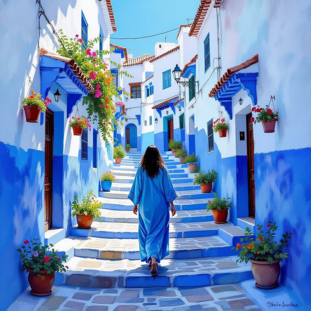 A vibrant watercolor of a woman ascending a blue staircase in Chefchaouen. Green plants add contrast in this artwork with expressive brushstrokes and an impressionistic style.