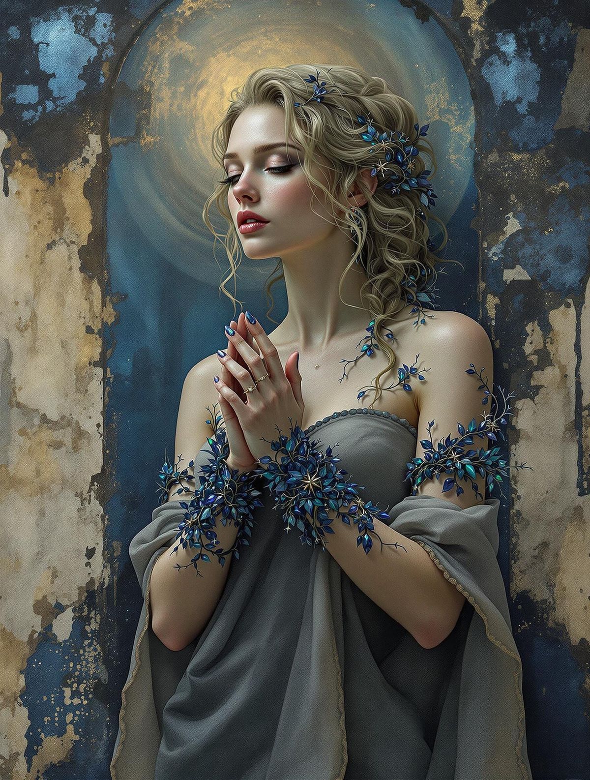 A mystical figure stands amidst a stormy backdrop, adorned with intricate runes and glowing iridescent moss, as she raises her arms in a gesture of hope and rebirth, set against a backdrop of ancient ruins and stormy skies.
