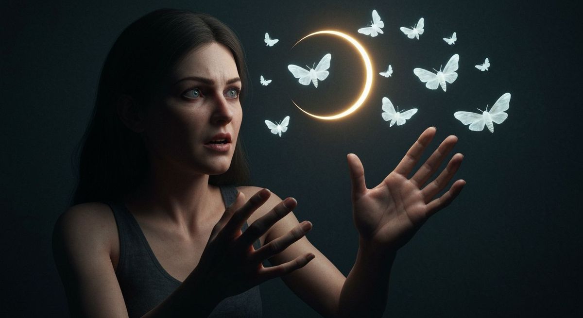 This image depicts a realistic portrayal of a woman in conversation with a swarm of unsettling, phosphorescent moths. The scene uses dim, dramatic lighting and a gritty aesthetic to evoke horror and delusion.