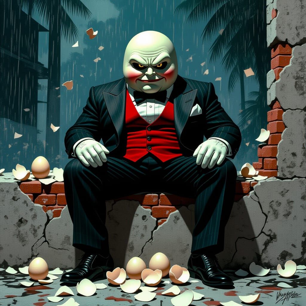 This image shows Humpty Dumpty in a Scarface-esque suit, perched on a dilapidated wall amidst eggshell shards. The backdrop evokes a gritty Miami setting, rendered with film noir and gangster aesthetics.