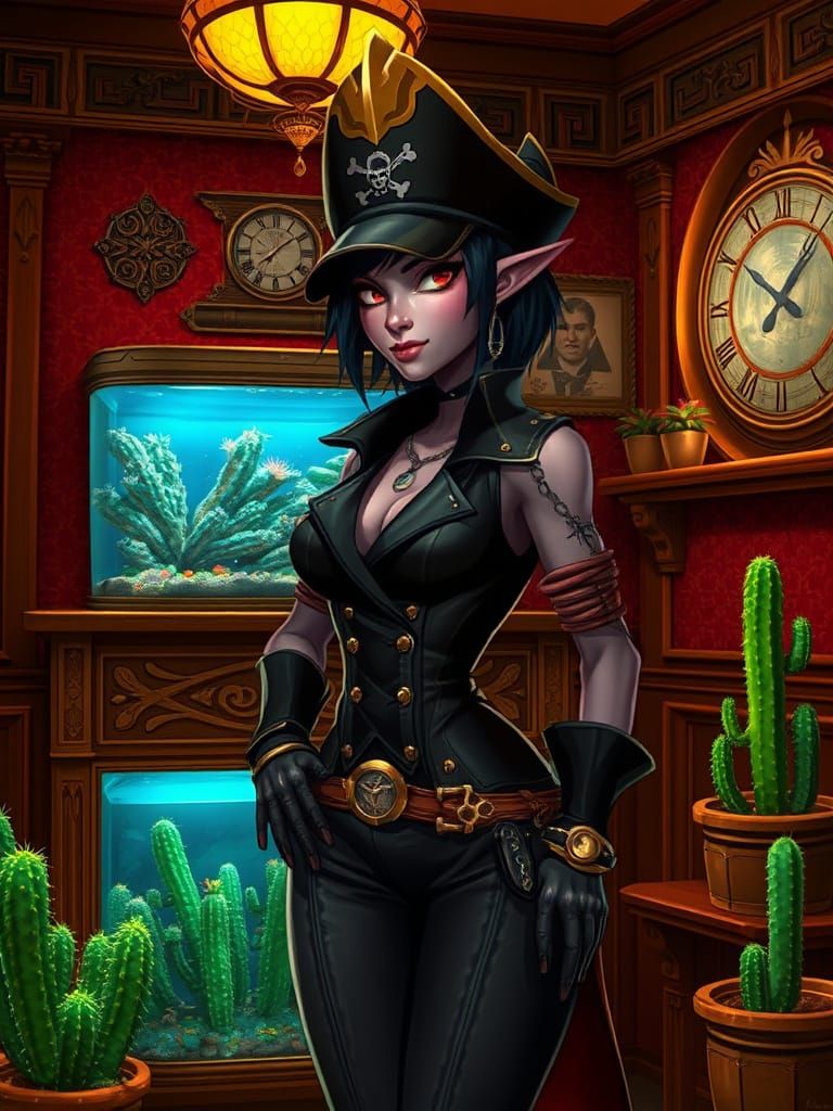 This image features a confident Duskwight Elezen woman in a sleek, dark uniform, surrounded by a vintage-inspired room with rich red wallpaper, intricate wooden details, and a colorful aquarium and cacti garden, evoking a warm, atmospheric lighting reminiscent of art nouveau and industrial styles.