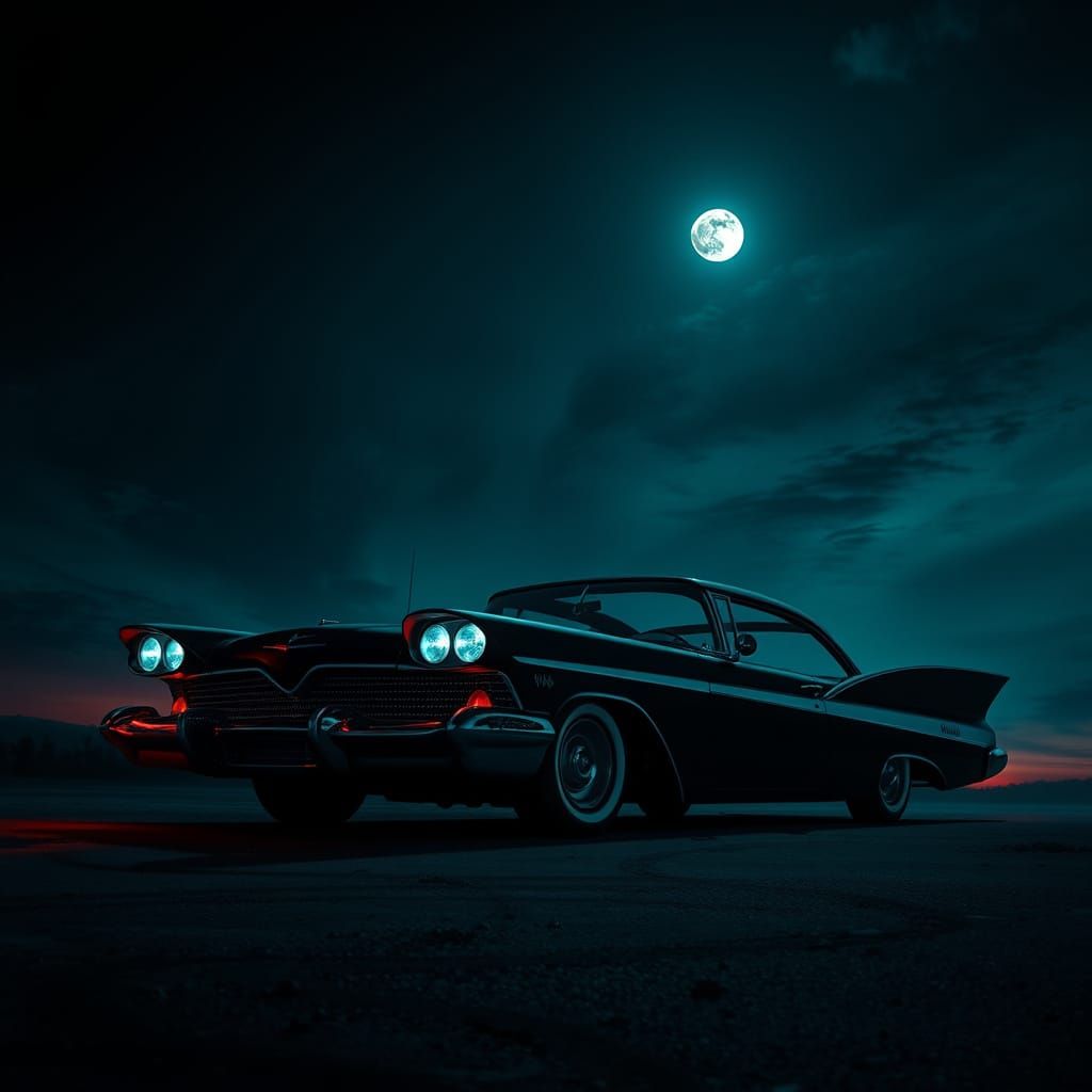 A dark image of a 1958 Plymouth Fury under a moonlit sky. The car is rendered with photorealistic detail, deep shadows, and ominous colors, in a biomechanical art style.