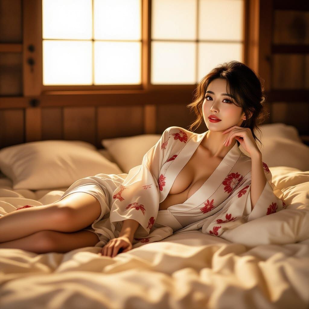 A fine art image of a Japanese woman in a sheer kimono on a messy bed. Warm golden light illuminates her elegant silhouette and sensual pose in a wooden bedroom.